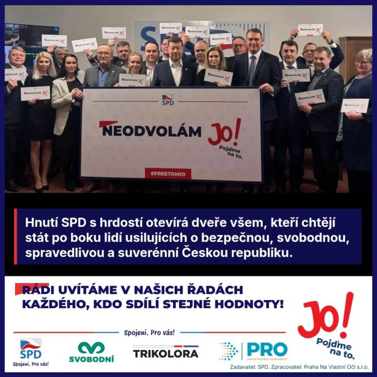 Hnutí SPD s hrdostí otevírá dveře všem, kteří chtějí stát po boku lidí usilujících o bezpečnou, svobodnou, spravedlivou a suverénní Českou republiku. Již dvě volební období působíme na té nejvyšší politické úrovni a máme pevné zastoupení v Poslanecké sněmovně, kde hájíme zájmy slušných občanů, pracujících rodin, seniorů i mladé generace.