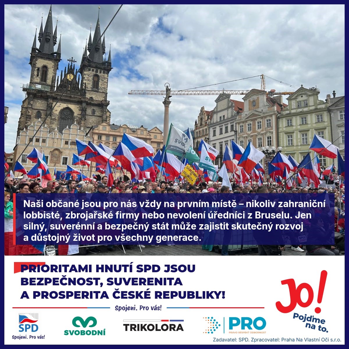 Hnutí SPD vždy hájilo a bude hájit národní zájmy České republiky. Naší prioritou je bezpečnost, suverenita a prosperita naší země – ne diktát z Bruselu, ne nekonečné konflikty za hranicemi, které nám nic nepřinášejí.