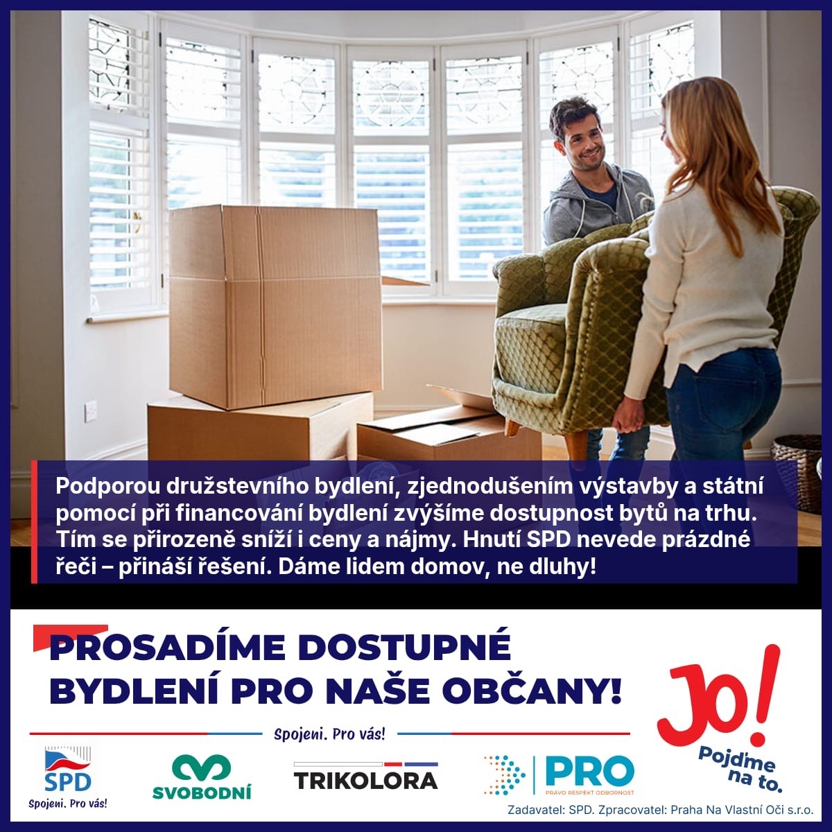 Hnutí SPD má pro dostupnost bydlení konkrétní a funkční řešení. Postaráme se o zásadní změnu ve stavebním právu. Stávající procesy povolování staveb jsou neúnosně zdlouhavé a byrokratické. Proto prosadíme změnu stavebního zákona tak, aby se v České republice konečně mohlo jednodušeji, rychleji a levněji stavět. Bydlení nesmí být rukojmím úředníků a developerské lobby.